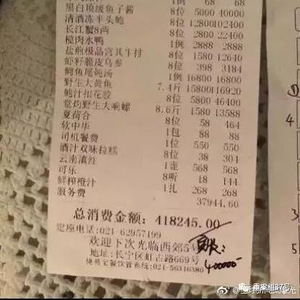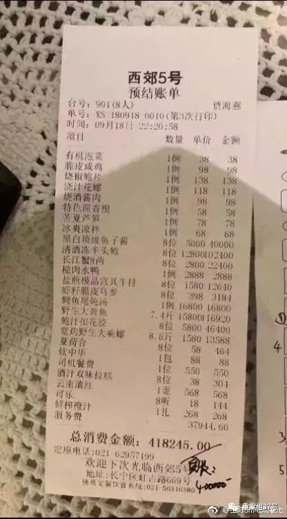 最近“上海天价账单”在网络上闹得沸沸扬扬。网上爆出在上海“西郊5号”餐厅,8个人就餐,一共点了20道菜,算上服务费,总价超过40万元的“天价账单”。这不仅让网友关注,也让市场监管局介入调查。