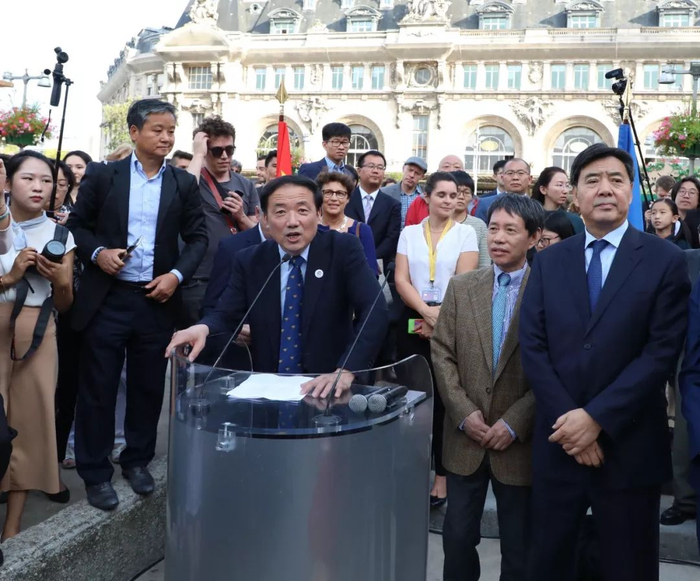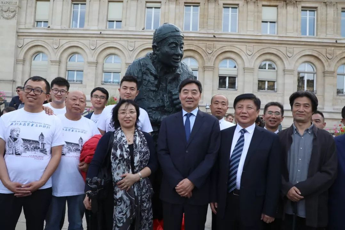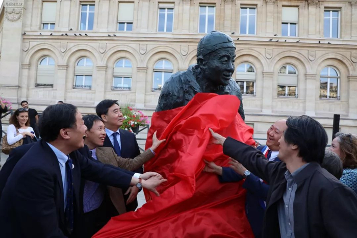 翟隽、孙建功、罗贝尔、陈文雄、拉蒂 - 埃尔巴兹等中法嘉宾为雕像揭幕。