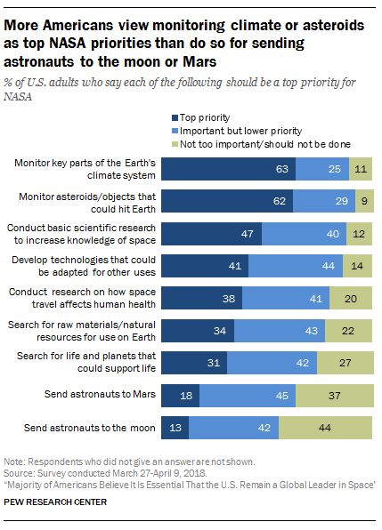 大多数人认为:监测气候或跟踪小行星应该是美国宇航局的首要任务。