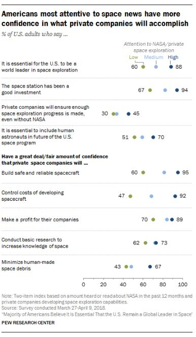 那些最关注太空新闻的人强烈支持美国成为太空探索的世界领导者,并相信国际空间站对该国来说是一项很好的投资。例如,88%听过大量太空新闻的人认为,美国成为太空探索的全球领导者至关重要。