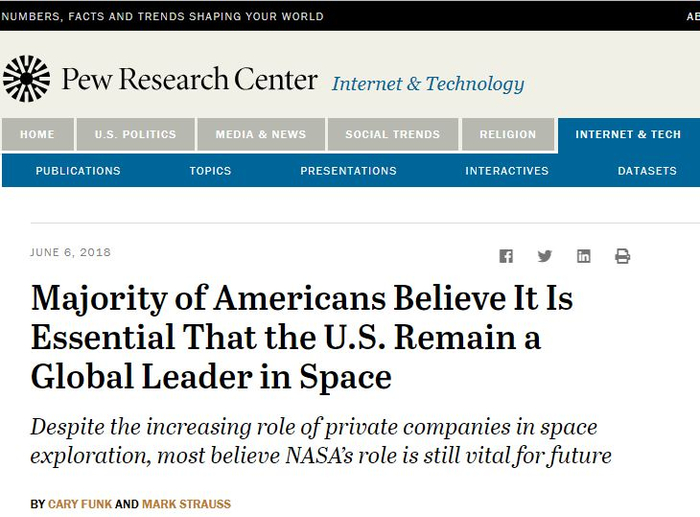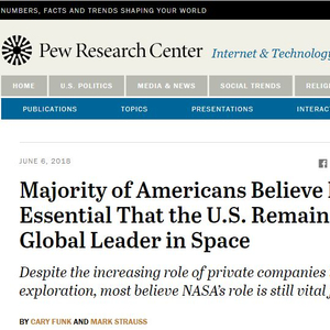 皮尤研究中心于2018年3月27日至4月9日进行的一项全美调查显示,大多数美国人认为太空是一项很好的战略投资,太空能力也是美国保持全球领导地位的中重要因素。本次调查中还反映了美国人对其他太空问题的不同态度,现由学术plus编译主要调查内容与结论,仅供参考。文章版权归原作者所有,观点不代表本机构立场。