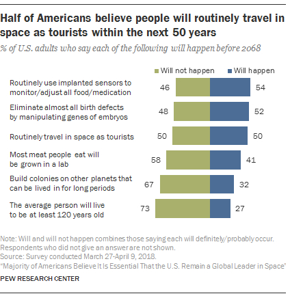 美国人期待未来的一系列科学和技术发展。但公众对未来50年太空旅游的前景存在分歧。大约三分之一的美国人(32%)认为在其他星球上建立可长时间居住的殖民地将在2068年建成。