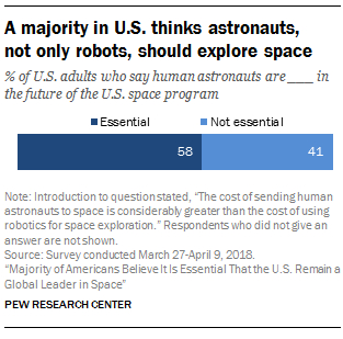 一些太空专家认为,在漫长的星际旅行中维持宇航员所需的生命支持系统将非常昂贵,以至于发送机器人探测器会更具成本效益。关于未来的太空探险,大多数美国人表示,他们认为必须让人类,而不仅仅是机器人来此旅行。总体而言,58%的美国成年人认为必须在美国太空计划中使用人类宇航员,而41%的人认为宇航员并非必不可少。