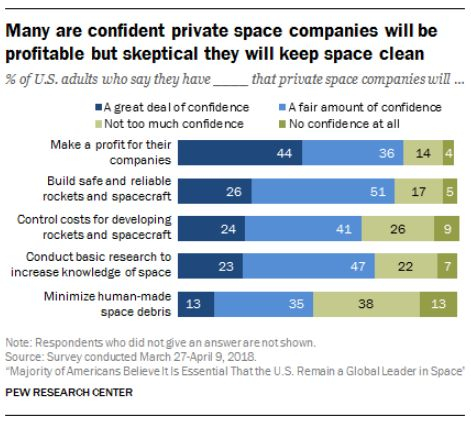 SpaceX,Blue Origin和Virgin Galactic等私人公司继续开发太空探索能力,曾经是NASA等政府机构的唯一权限。大约44%的美国人非常有信心这些公司将在其与太空相关的企业中获利,其中36%表示他们相信太空公司将盈利。