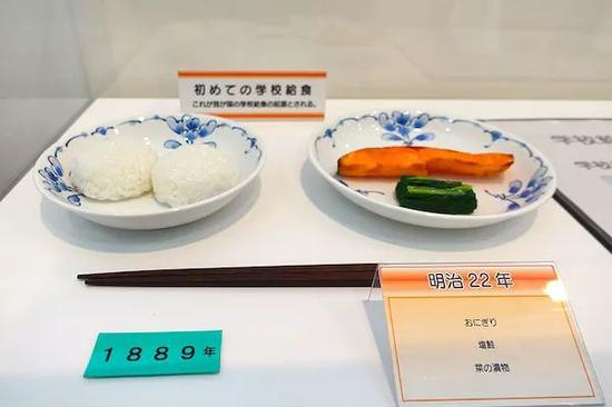 1889年(明治22年),前文提到的山形县鹤岗町私立忠爱小学校所提供的午餐,便是这些:泡菜、三文鱼和饭团,免费提供给贫困家庭的学生。