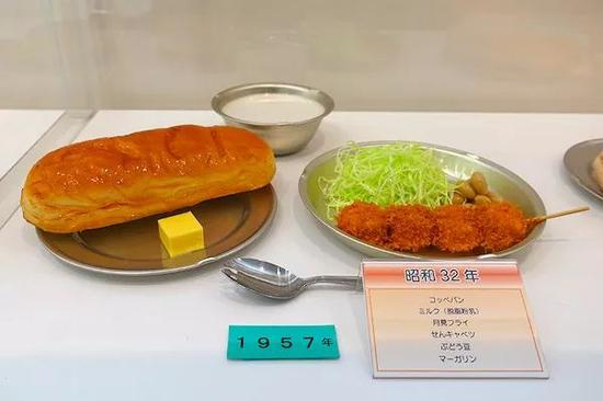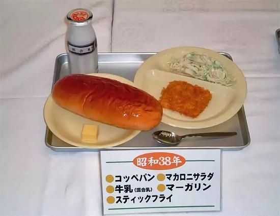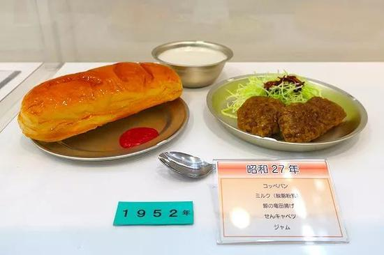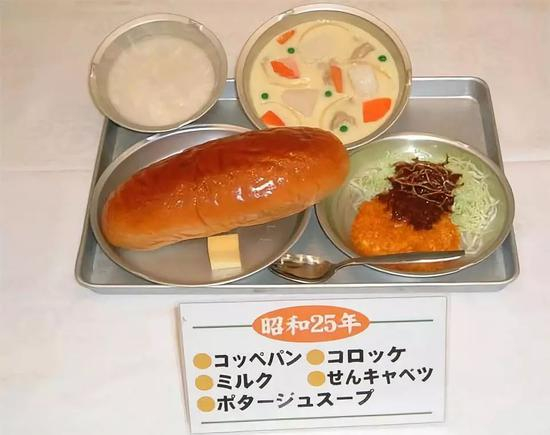 1950年,日本八个主要城市的小学学龄儿童迟到了完整的学校午餐,并加入了使用美国小麦面粉制作的面包。典型午餐包括土豆炖肉、炸肉饼、切片卷心菜和牛奶面包卷。