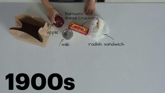 最后,我们分享一则视频,视频内容是现代美国少年儿童品尝从1900年-2000年这一百年间的美国“黄包餐”(用黄色纸袋包装的食物,是带去上学、工作吃的)并给出自己的评价,这其中也能看出100年间美国校园食物的变化,不用理解英语,看表情就能懂。