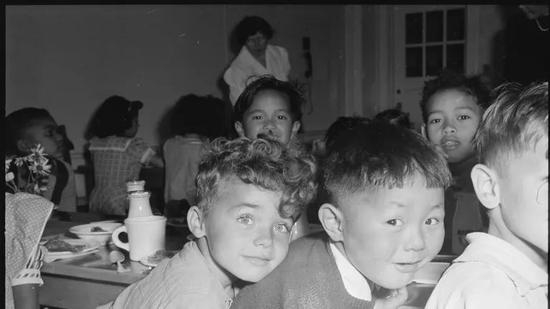 战争期间被拘留的日本人子女与其他美国儿童一起吃学校午餐,1942年旧金山