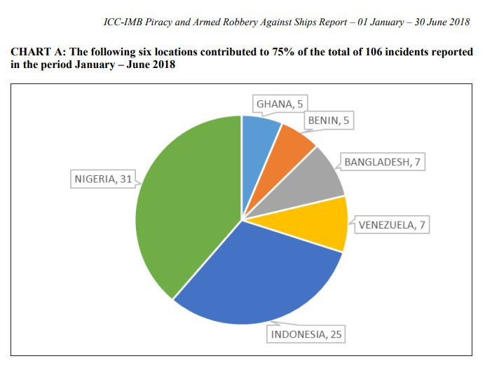 今年以来,海盗问题愈发严重。据国际海事局IMB发布的2018上半年《海盗和武装劫持船只报告》,今年上半年全球海域共发生107起海盗事故,而2017年同期仅为87起。