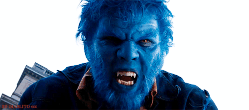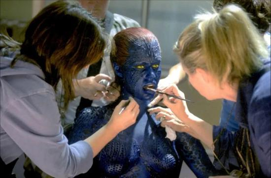 X战警系列电影中也有很多蓝肤色的角色,这有可能是变种人的X基因的一种性状,也有说法称蓝色是自然状态下生物身上最少见的一种颜色。