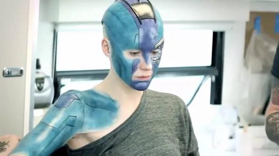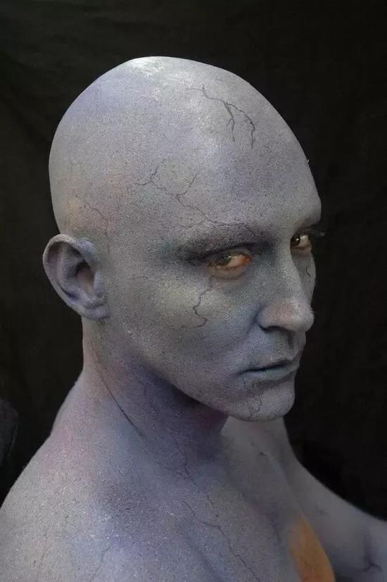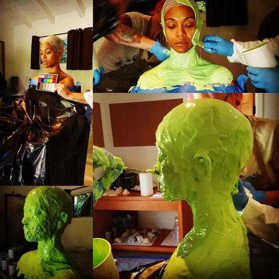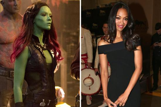 为塑造离“人类”较远,但又不能太远的角色,最常用的手段就是换肤色,《银河护卫队》里的外星人非常多,自然少不了化妆的帮忙,比如佐伊·索尔达娜饰演的卡魔拉: