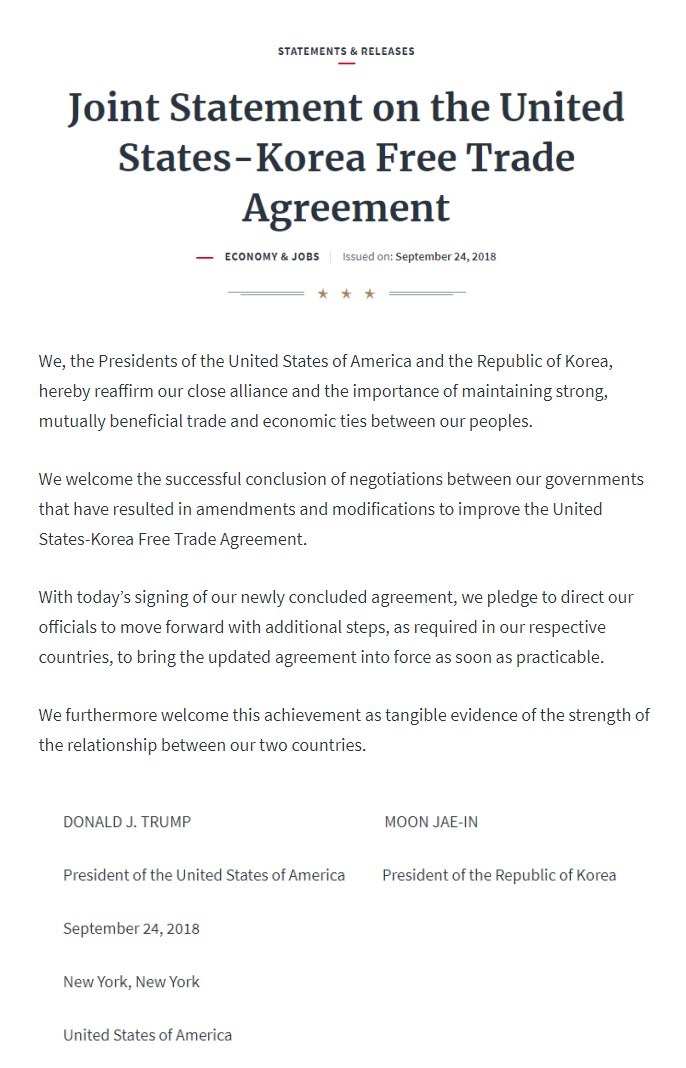 以下是白宫公布的《美韩自由贸易协定联合声明》