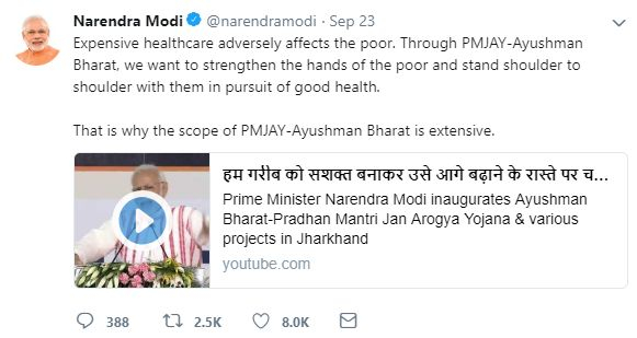 莫迪23日连发四条推特,称“我们希望紧握穷人的手,与他们肩并肩追求健康”,“它展示了我们建立一个健康印度不可动摇的决心”。
