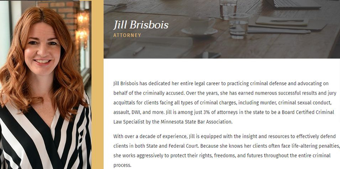 Jill Brisbois目前已经从业12年之久。在律所的个人介绍中,主要强调她擅长处理刑事案件的指控,特别是谋杀和性侵。