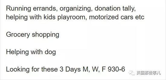 跑腿,整理,捐赠记录,帮忙整理孩子的游戏室,车子等等。