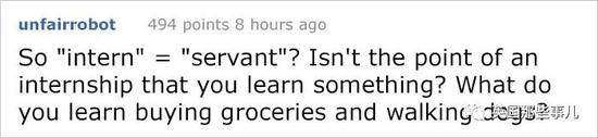“所以,实习生=佣人?难道实习的目的不是为了学到一些东西吗?请问去超市采购,遛狗能学到啥?”