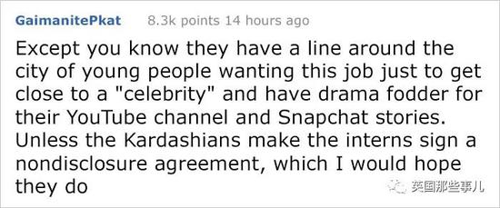 “估计想要申请这个工作的小孩排成队可以绕城市一圈了吧,他们想要做这个工作只是想要接近这些所谓的明星,然后可以把看到的各种八卦放到自己的油管和snapchat上,除非卡戴珊让这些实习生签署保密协议。”