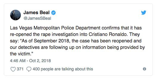 据CNN报道,美国拉斯维加斯警方10月1日宣布重启一例2009年性侵事件的调查,球星C罗正是该案的嫌疑人。