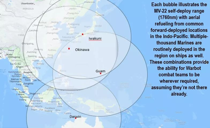 无论是开始两栖航运还是在日本,澳大利亚,关岛或其他地方的陆地上,这些战斗机器人与传统概念相比具有最低的后勤要求和出色的火力,这正是国防战略所需要的:致命,敏捷,弹性。此外如果战斗机器人增援部队需要“迟滞”任何与美国和盟国利益相悖的潜在敌对行动,下面的图形说明了诸如海空特遣部队(MAGTF)MV-22和KC-130s等平台的速度。