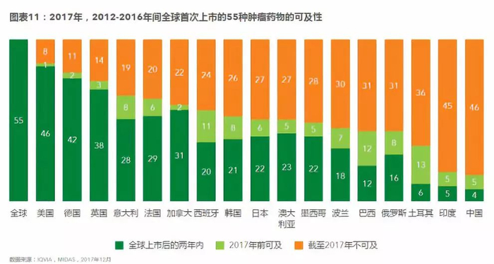 此外,据专业咨询机构IQVIA的统计,2012至2016年,全球共首次上市55种抗癌药,其中美国两年内上市的有46个,中国只有4个,甚至低于印度和土耳其。