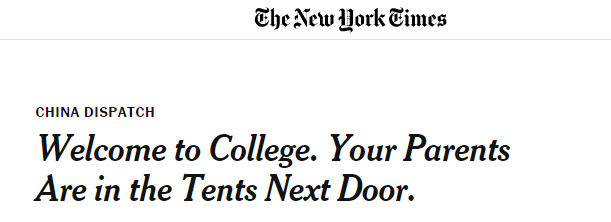 ▲“欢迎来上大学,你的家长就住在隔壁的帐篷里”(via New York Times)