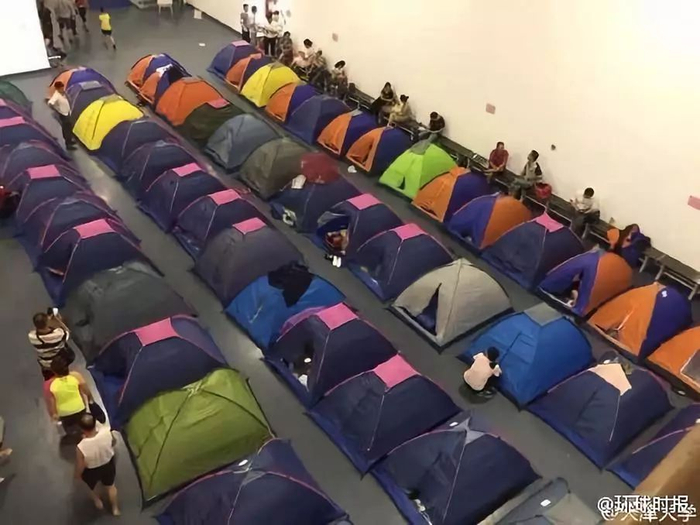 考虑到这一点,天津大学从2012年起,每年大一开学时都会在体育馆准备许多顶帐篷,还配备了空调和洗澡等设施,让没订酒店的家长们也有地方住,可以近距离陪伴孩子入学。