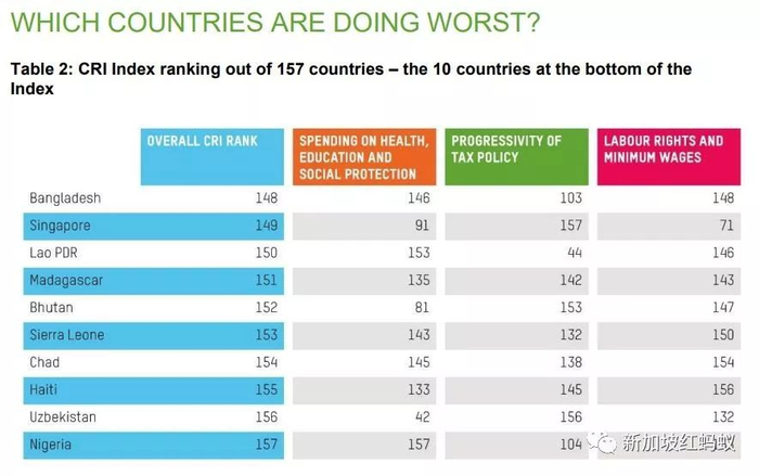 在这项“承诺减少不平等指数(Commitment to Reducing Inequality Index,简称CRI)”中,垫底的是西非国家尼日利亚,新加坡则位居全球157个国家的第149位(也就是倒数第九)。