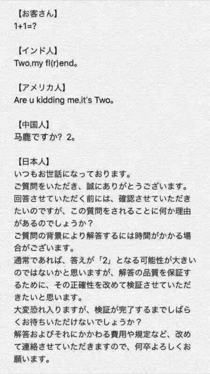 客人问:1+1=? 来看各个国家的人怎么回答。