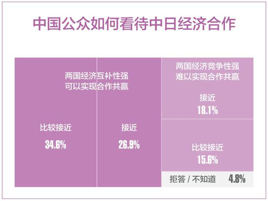 中国公众认可经济因素作为两国关系基本面的重要性,认为两国经济合作互补性强,对两国经贸合作回暖的信心明显回升。多数中国公众对全球化和世界自由贸易体制持肯定性评价,对中日合作推动区域经济一体化,建设东亚经济共同体,构建开放型世界经济态度明确。