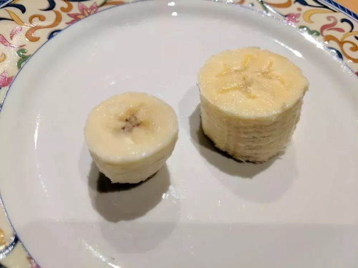 但切开后,就能看出明显差异了!右边的高级香蕉,明显色泽比较鲜艳。
