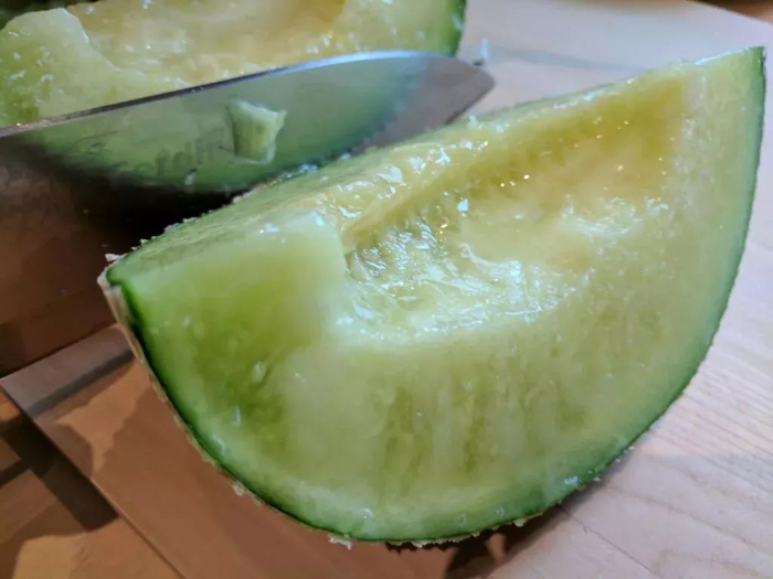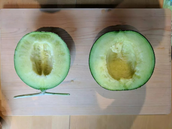 外表看不太出来差在哪儿,切开后差别也依然不明显。左边的普通哈密瓜,颜色看起来较深。