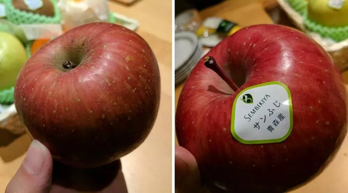 先来看看,我们平时最常吃的苹果。左边一颗,是花费 170 日元(10 RMB)买来的的普通苹果;右边一颗,则是花费 1800 日元( 100 RMB)买来的富士苹果。