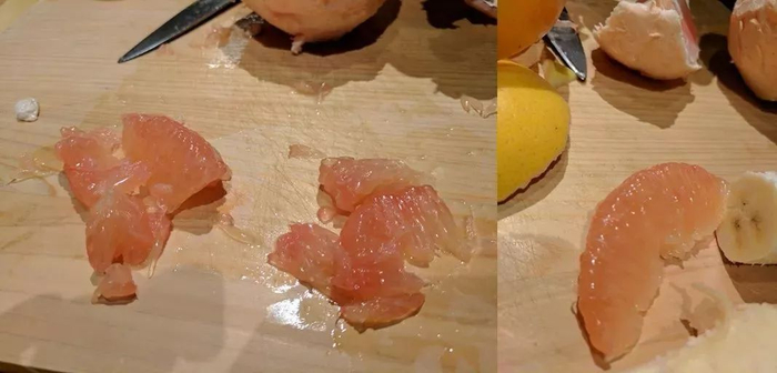 尽管该网友切西柚的时候,非常谨慎,但普通西柚的果肉切开后,已经散烂不堪。高级柚子的果肉却没有这种情况,还是非常完整的。