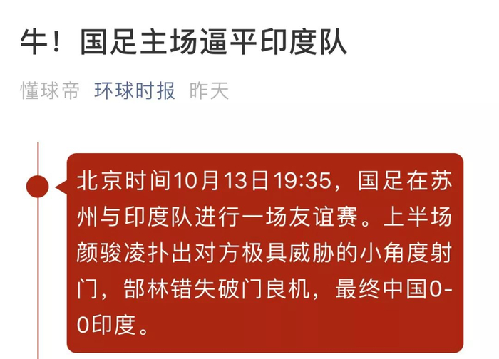 0-0平局,这就是27亿人凑出来的30多个人给球迷的交代,既看到了精彩的足球,又收获了真正的广告,还见证了伟大的友谊,中印果然是好兄弟,非!常!好!