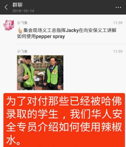 是的,你没看错,“辣椒水、华人安全专员、针对哈佛录取学生”,言下之意就是,你来参加集会,出现意外状况也不用害怕,我们给您配备了专业人员,教您正确使用辣椒喷雾保护自身安全!游行准备辣椒水,这是准备打架吧?要是不清楚这次集会的呼声和诉求,单单看这聊天内容,真的很容易被误导成打架斗殴和人身攻击事件了。