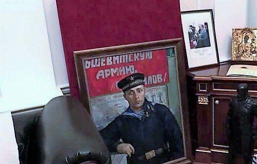 房间里面有衣柜、办公桌、沙发。墙角一张小桌子旁边摆放着圣母的圣像,墙上则挂着一幅基督的画像。普京父亲穿军装的大幅肖像也摆放在醒目位置。“这是我父亲在塞瓦斯托波尔拍的照片,他是一名水兵。”普京指着父亲肖像。