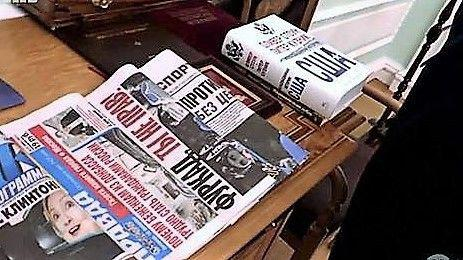 休息室中间一张大圆桌上,摆放着果盘和蜜罐。接下来,普京领着摄制组前往第三间办公室——“御用书房”参观。这里有办公桌、书柜、甚至还有壁炉。一张小桌上整齐摆放着当天出版的主流报纸。右侧还有一本有关美国的大部头专著。