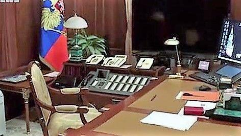 摄制组这次是从普京座位的角度拍摄的画面,展示了办公桌上的很多细节,譬如写字台上标注着“机密”字样的橙色公文袋,上面还放着一把剪刀。