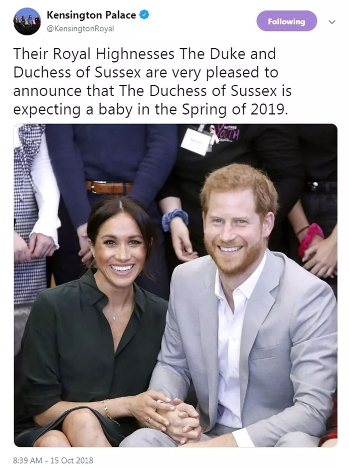 10月12日,梅根·马克尔(Meghan Markle)和哈里王子(Harry)在尤金妮公主(Eugenie)与杰克·布鲁克斯班克(Jack Brooksbank)在温莎城堡举行的婚礼上正式宣布:梅根怀孕了,女王陛下将于明年春天迎来她第八个曾孙。