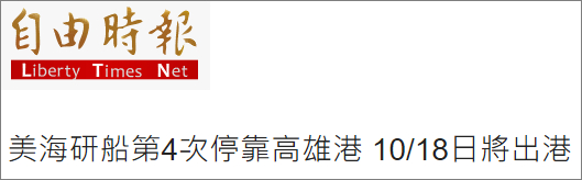 ▲台湾《自由时报》10月16日报道称,美国海军研究办公室排水量达3250吨的科学研究船“托马斯”号于15日停靠于台湾高雄港,预计本月18日晚间11时离开高雄前往澳大利亚。