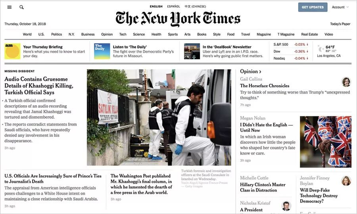 卡舒吉的死这两天仍然是英美各大媒体重点关注的头版头条。