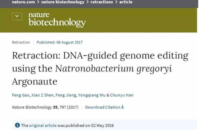 2017年8月2日,韩春雨决定主动撤销他在《自然 · 生物技术》上发表的争议文章。