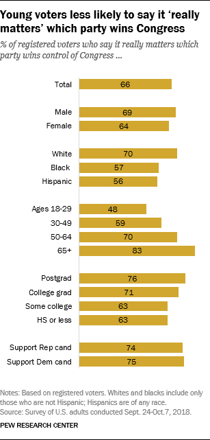 74%的共和党选民和75%的民主党选民表示,中期选举后哪个党派控制国会“真的很重要”。不过,不同年龄段选民的看法存在差异。譬如,30岁以下的登记选民中,只有48%的人认为哪个党控制国会“真的很重要”;而65岁及以上的选民中,83%的人持此观点。
