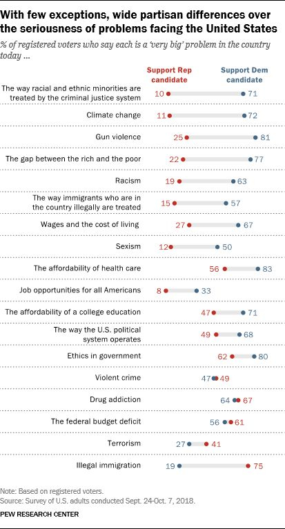 调查共列出了18个问题:美国刑事司法体系对待少数族裔的方式、气候变化、枪支暴力、贫富差距、种族主义、对待非法移民的方式、工资及生活成本、医保费用、大学教育费用、美国政治体系的运作方式、政府道德、药物成瘾、联邦赤字、性别歧视、暴力犯罪、全体美国人的就业机会、恐怖主义、非法移民。对于这些问题的严重性,共和党选民和民主党选民的看法迥异。