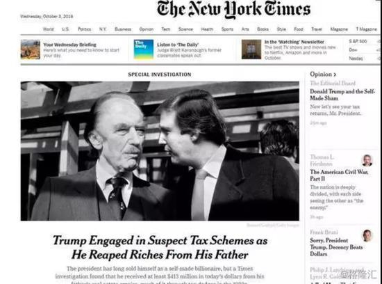 10月2日,《纽约时报》的重磅调查报告:特朗普家族涉嫌税务欺诈。调查发现特朗普父亲向子女转移近10亿美元资产。这和特朗普宣称的“我的成功多半是靠自己,只从父亲那里拿过100万美元贷款”的奋斗故事完全不一样。