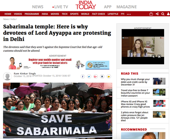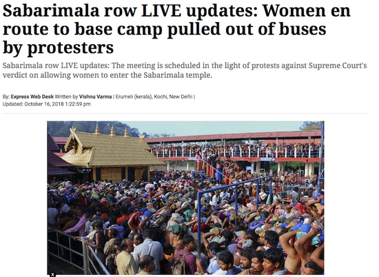 9月28日,印度最高法院解除禁止10-50岁女性进入Sabarimala神庙的禁令。位于印度克拉拉邦的印度教Sabarimala神庙于10月17号起,对所有妇女开放。随后,民众举行了大规模游行抗议,并要求恢复神庙的百年传统。警方逮捕了11名试图阻止女信徒进入神庙的抗议者,并拆除了示威者临时搭建的休息场所。警方为前往神庙的女信徒提供安全保护。