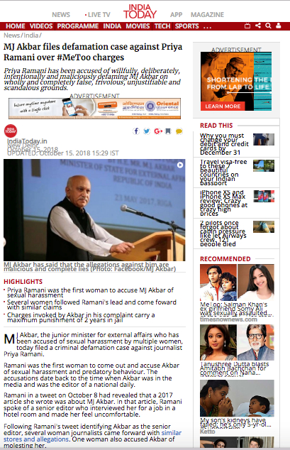 15日,刚从非洲访问回国的印度外交事务国务部长阿克巴起诉记者拉玛妮诽谤罪。14日,多名女性控告阿克巴性骚扰。拉玛妮是第一位站出来控告阿克巴的女性,指控追溯到阿克巴在国家日报做编辑时,在酒店房间的一次工作中让她感到不安。阿克巴拒绝指控,并发表声明称“拉玛妮以完全错误的、轻佻的、不正当的、诽谤性的理由故意地、有意地、恶意地诽谤阿克巴。”4个记者团体要求阿克巴在案件调查过程中辞职。