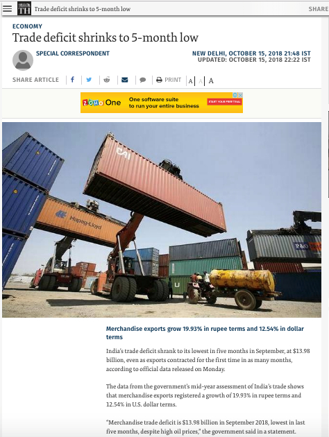 10月15日,印度政府贸易年中评估数据显示,9月份,虽然印度出口首次在数月中出现萎缩,但印度商品贸易逆差降到5个月以来的最低水平,为139.8亿美元 。 其中显示大幅增长的出口商品主要包括:石油产品(26.8%)、有机和无机化学品(16.9%)、药品和药物(3.8%)以及棉纱/纺织/化妆品、手织产品等(3.6%)。