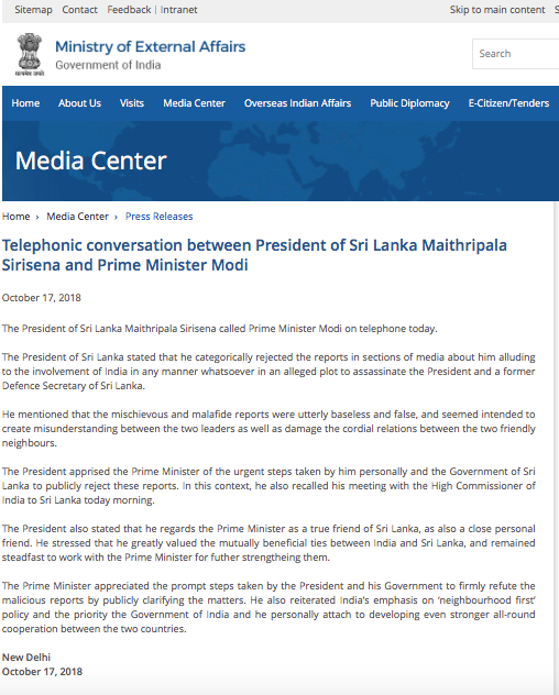 斯里兰卡总统西里塞纳17日致电印度总理莫迪,称他坚决否认关于他暗指印度参与对斯里兰卡总统及前国防部长进行行刺阴谋的报道。他提到恶意报道没有任何根据,是有意在两国官员间制造误解,破坏友好邻国的关系。印度总理莫迪对斯里兰卡总统及政府及时反驳恶意报道、澄清事实表示感谢。两国领导人表示,要继续加强两国关系。