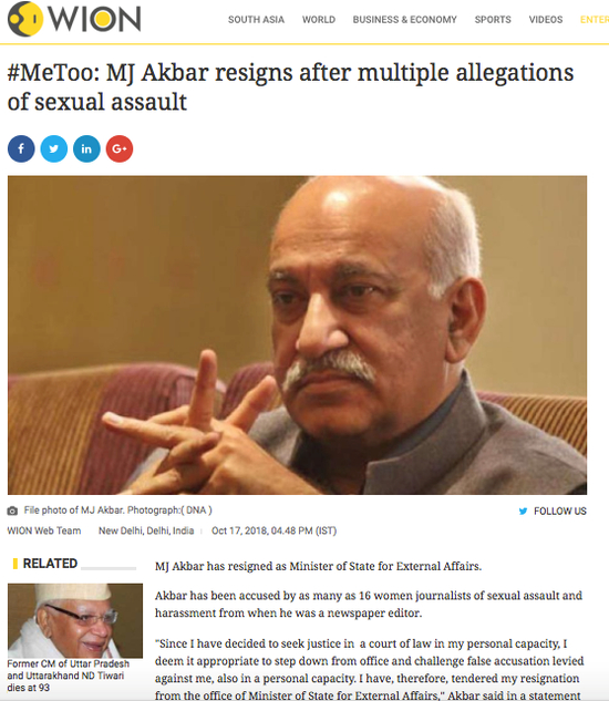 印度外交事务国务部长阿克巴于10月17日辞职。此前,16名女性记者指控阿克巴在担任报纸编辑时,对她们进行性侵或性骚扰。阿克巴发表声明称他决定以个人身份通过法律寻求公正,辞去职务并以个人身份挑战不实指控。